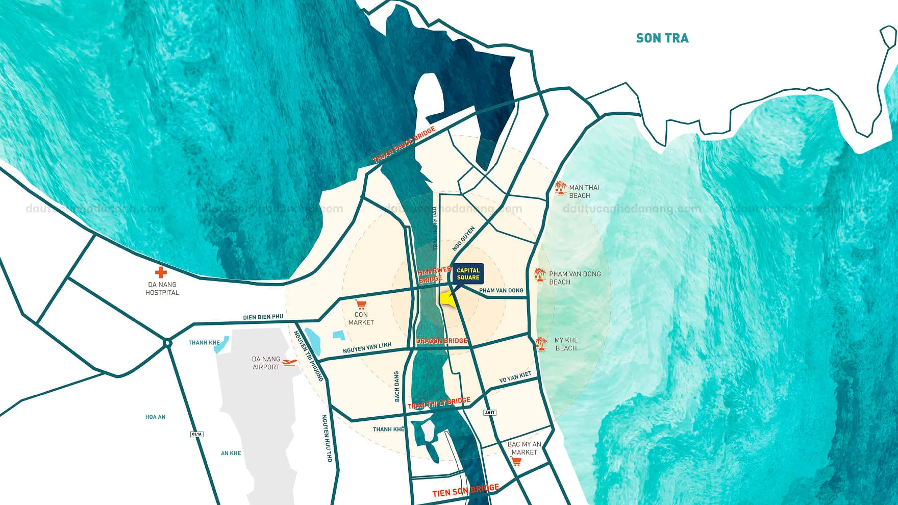 Capital Square Đà Nẵng sở hữu vị thế “tâm điểm của tâm điểm” khi nằm trọn trong quỹ đất vàng hiếm hoi tại bờ Đông sông Hàn. Dự án là giao điểm của ba luồng giá trị: Trung tâm hành chính cũ – Trung tâm tài chính mới – và Trục du lịch biển quốc tế.